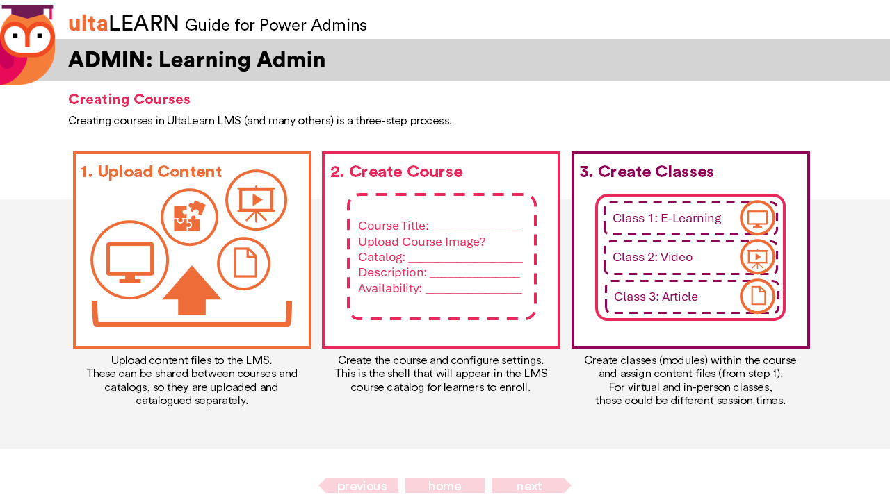 Simplified a multi-step administrative process into a clear, visual framework to help users understand how courses are built within the LMS before executing the task. This approach supports both comprehension and confidence when navigating more complex system functions.
