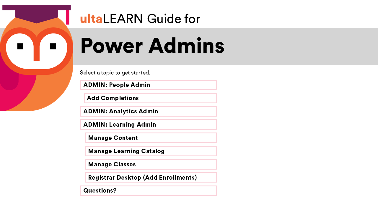 Example of a role-specific guide developed as part of a broader set of LMS onboarding resources. Each user group received a customized guide showing only the features and workflows relevant to their role, reducing cognitive load and supporting faster adoption.